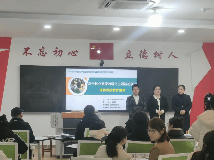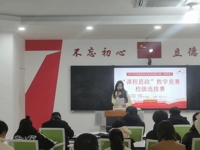 为深入贯彻习近平新时代中国特色社会主义思想和党的二十大精神,深入贯彻落实《高等学校课程思政思政建设指导纲要》要求,全面落实立德树人根本任务,2023年12月13日,我校举行2023年安徽省职业院校技能大赛(高职组)“课程思政教学竞赛” 校级选拔赛。本次教学竞赛由教务处主办,马克思主义学院承办,分为院级初赛和校级决赛两个环节,经过各学院初赛选拔,最终有12位教师进入决赛。决赛在马克思主义学院虚拟仿真实训教室举行,马克思主义学院全体思政课教师、部分学生代表现场观摩本次比赛。