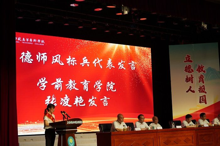 省优秀教师付红波和受表彰的师德师风标兵代表、优秀教师代表、优秀教育工作者代表、优秀辅导员代表、先进集体代表分别发言。他们分享了自己对教师的责任、使命、担当、情怀的理解和坚守,表示未来将继续怀揣对教育的热爱与执着,继续提升师德修养和业务水平,以更加饱满的热情投入到教育事业中,为阜阳幼专辉煌的明天、为国家的教育事业贡献自己更大智慧和力量。