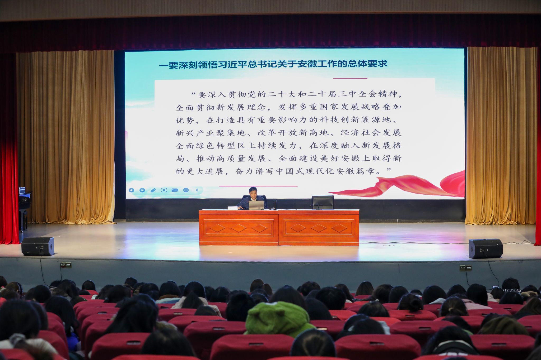 12月11日下午,校党委副书记、校长汤志深入小学教育学院,宣讲习近平总书记考察安徽重要讲话和党的二十届三中全会精神。宣讲报告会由小学教育学院党总支书记朱启俊主持,2024级400余名新生参加宣讲报告会。