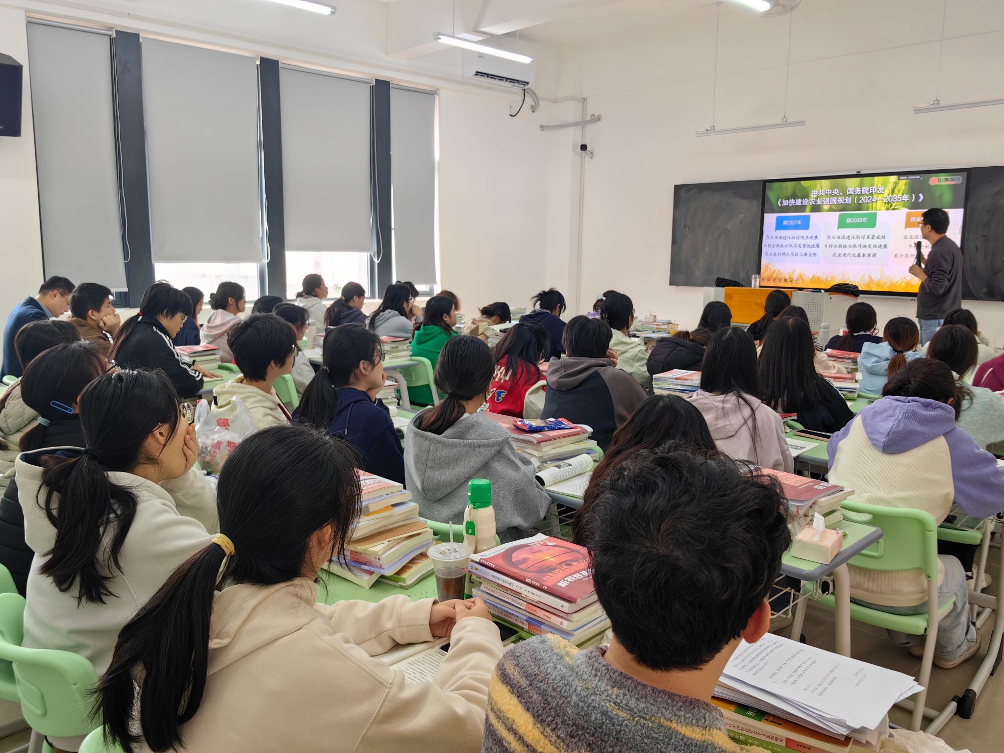 梁晨来到行知楼304教室,听取了杨严严老师讲授的《形势与政策》第四讲——“阔步迈向农业强国”。杨严严老师紧扣党中央关于全面推进乡村振兴、加快建设农业强国的战略部署,以农业强国建设的时代意义为切入点,结合自己家乡农业在产业升级、科技赋能、农民增收等方面的发展变化,通过鲜活的地方实践案例、详实的数据对比与互动式教学方法,系统阐释了加快建设农业强国对于保障国家粮食安全、夯实高质量发展根基、促进共同富裕的重要性。课堂上,学生专注投入、积极互动,学习热情饱满,教学目标有效达成,课堂效果良好。