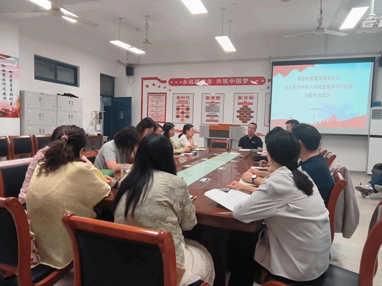 为推进深入贯彻中央八项规定精神学习教育走深走实,强化党员干部作风建设,5月23日,健康和管理学院党总支在至善楼403党员活动室开展“深入贯彻中央八项规定精神”主题党日活动。学院党总支负责人严岳峰主持活动,全体党员参加。