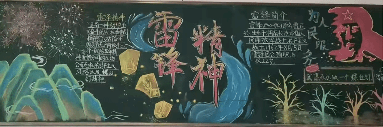 出一期“学雷锋”黑板报。3月初,学院要求各班以“学习雷锋精神,做新时代学生楷模”为主题出一期黑板报,各班充分发挥学生的主动性、积极性,黑板报主题鲜明、布局美观、图文并茂,内容涉及雷锋生平、雷锋日记、雷锋语录、雷锋事迹等。
