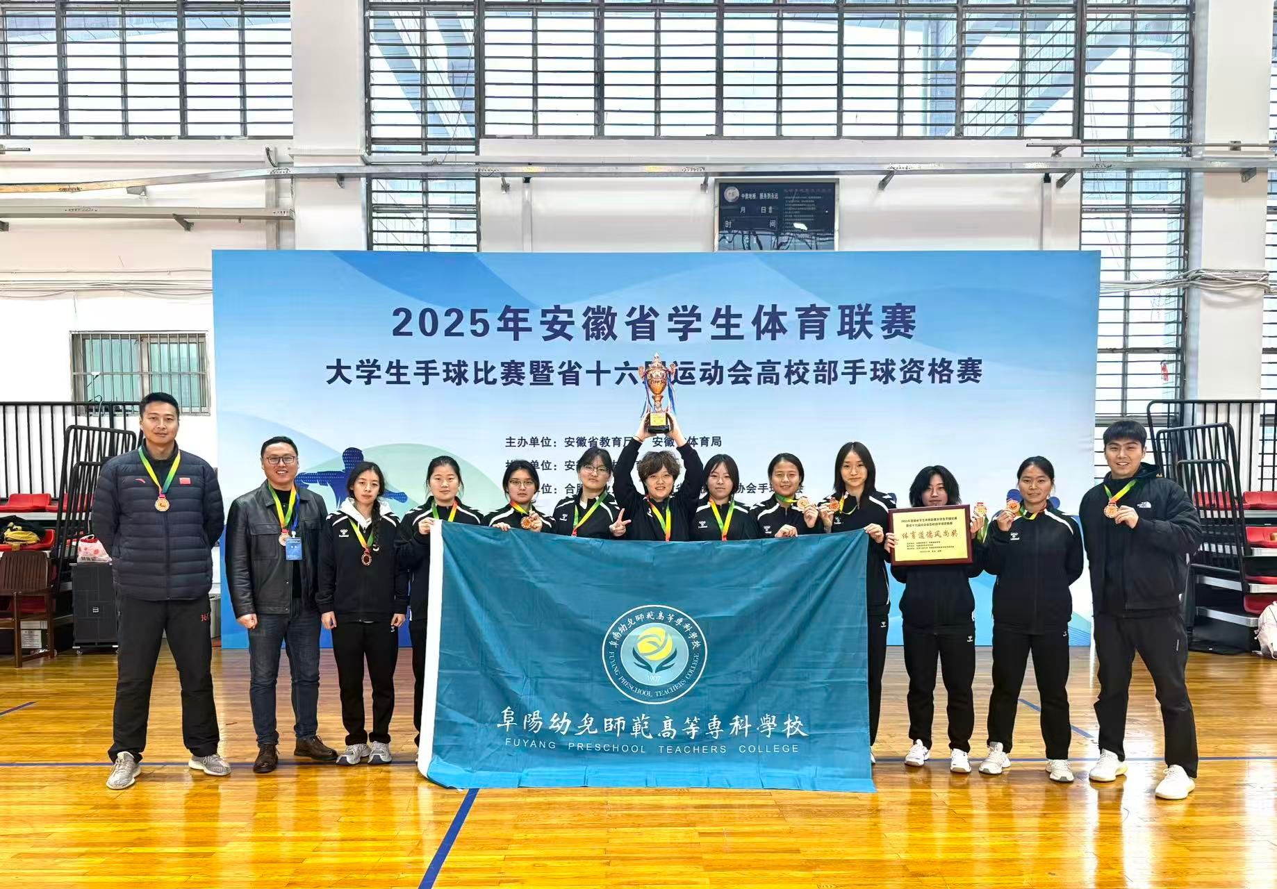 近日,2025年大学生体育联赛手球比赛暨2026年安徽省运动会资格赛圆满落幕。我校女子手球队首次亮相赛场,凭借顽强拼搏的意志攻坚克难,历经四场激战斩获铜牌,为校争光。