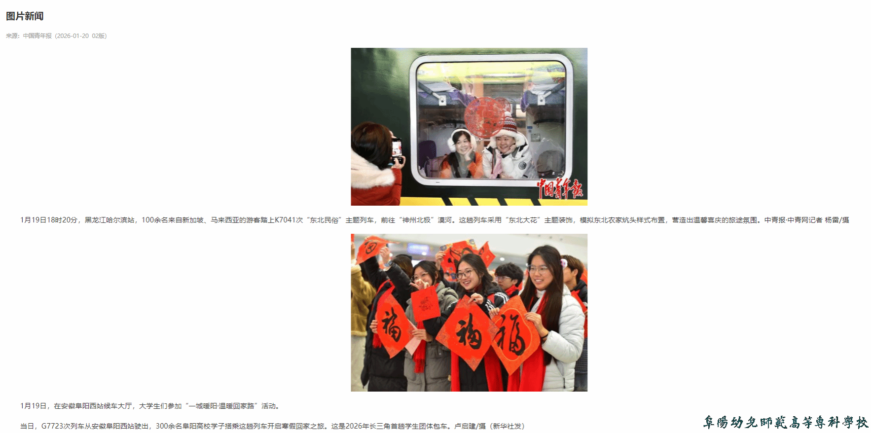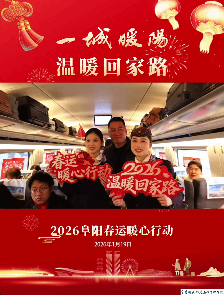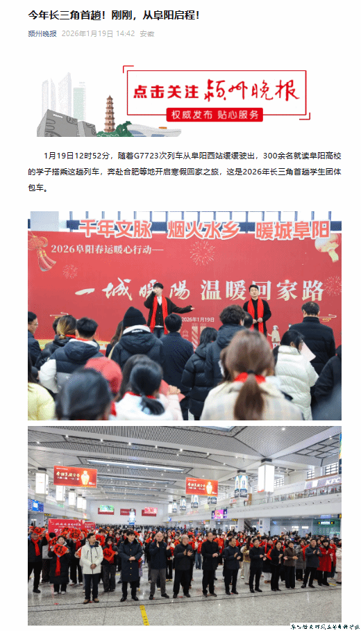 1月19日上午,阜阳幼儿师范高等专科学校岳家湖校区厚德楼前,近200名学子有序乘上公交专线,在老师们挥手送别中驶往阜阳西站乘坐爱心专列返乡。这是阜阳北站(阜阳西站)联合学校开展的“一城暖阳·温暖回家路”春运暖心行动,也是2026年长三角地区首趟学生团体专列。暖心行动启动仪式在阜阳高铁西站候车大厅举办,启动仪式现场,我校师生与颍州区文联联合为返乡学子献唱《我爱你中国》《一城暖阳》等歌曲,这些歌声也在同学们心中化作归途中的温情记忆。