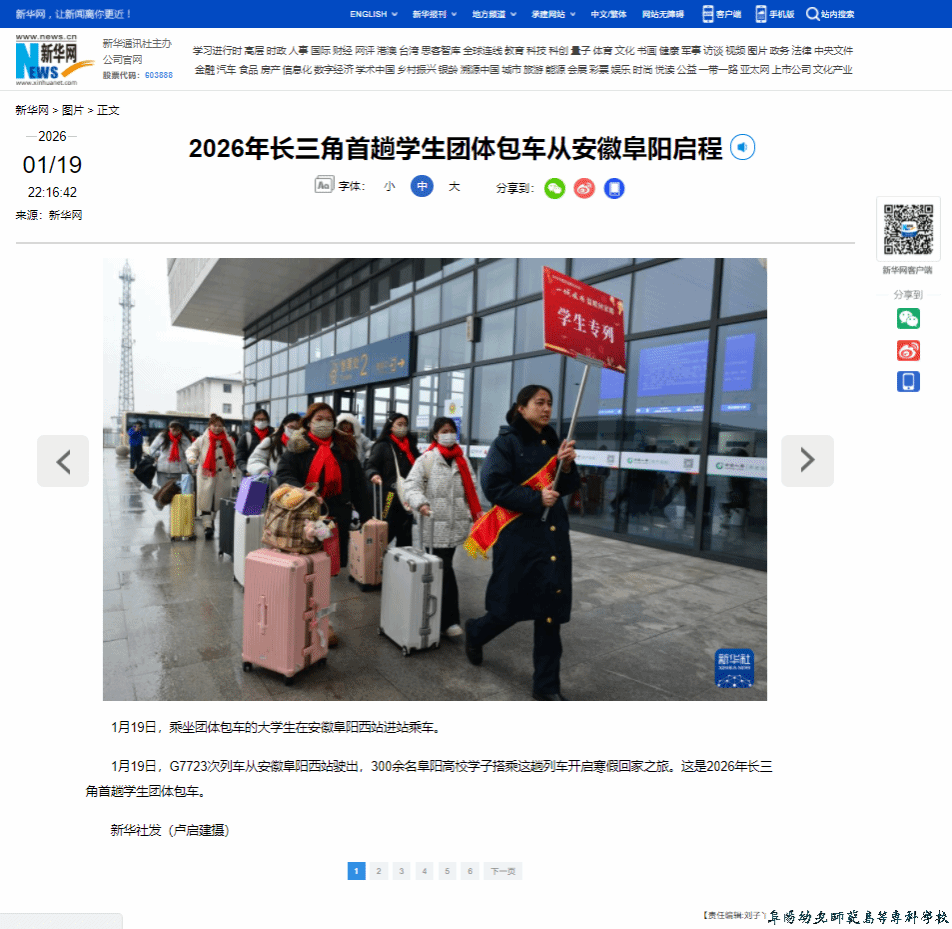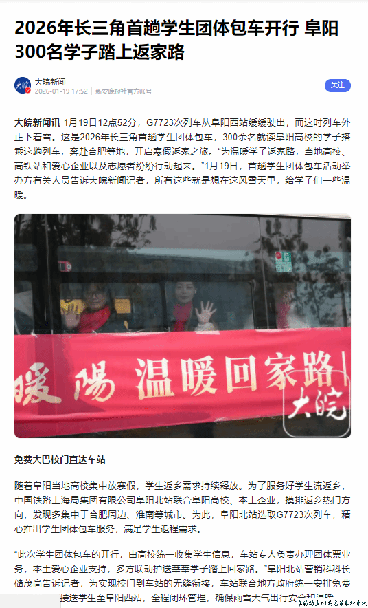 新华社、澎湃新闻、光明网、中国青年报、安徽日报、阜阳新闻网等多家媒体对我校春运暖心行动进行报道转发。