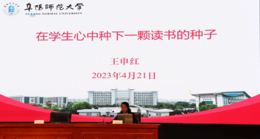 启动仪式后,阜阳师范大学图书馆馆长王申红教授作《给学生种下阅读的种子》读书辅导课。