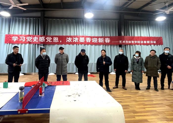 活动在欢乐的《迎新春》歌曲中拉开帷幕。孙驰发表热情洋溢的致辞,他说,过了二十四,家家写大字,写春联、贴春联是春节年俗的重要组成部分,是中华传统文化的精粹,春联集书法、文学、艺术、审美于一体,既体现红红火火的喜庆气氛,又描绘美好形象,表达美好愿望,也是反映时代精神和社会价值的窗口。艺体学院举办这次送春联活动,展示党史学习教育成果,讴歌新时代,传达正能量,形式活泼,氛围热烈,是新颖别致、极具意义的党员活动。