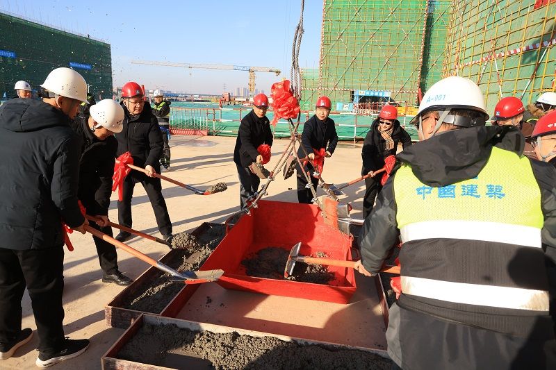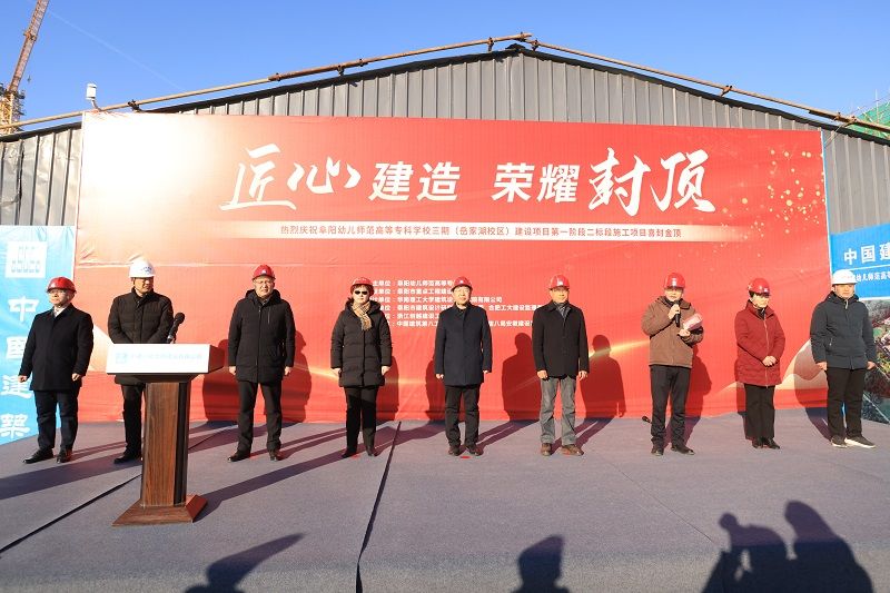2023年12月22日上午,阜阳幼儿师范高等专科学校岳家湖校区二标段项目建设现场举行小学教育学院主楼等建筑封顶仪式。校党委书记董志诚,校党委副书记、校长汤志,市重点工程处处长周黎,市城乡建设局总工程师许存,颍东区委常委、宣传部部长沙学珍及中建八局安徽建设发展有限公司董事长方涛等建设单位、监理单位负责人出席封顶仪式,校党委委员、副校长许宗志主持仪式。