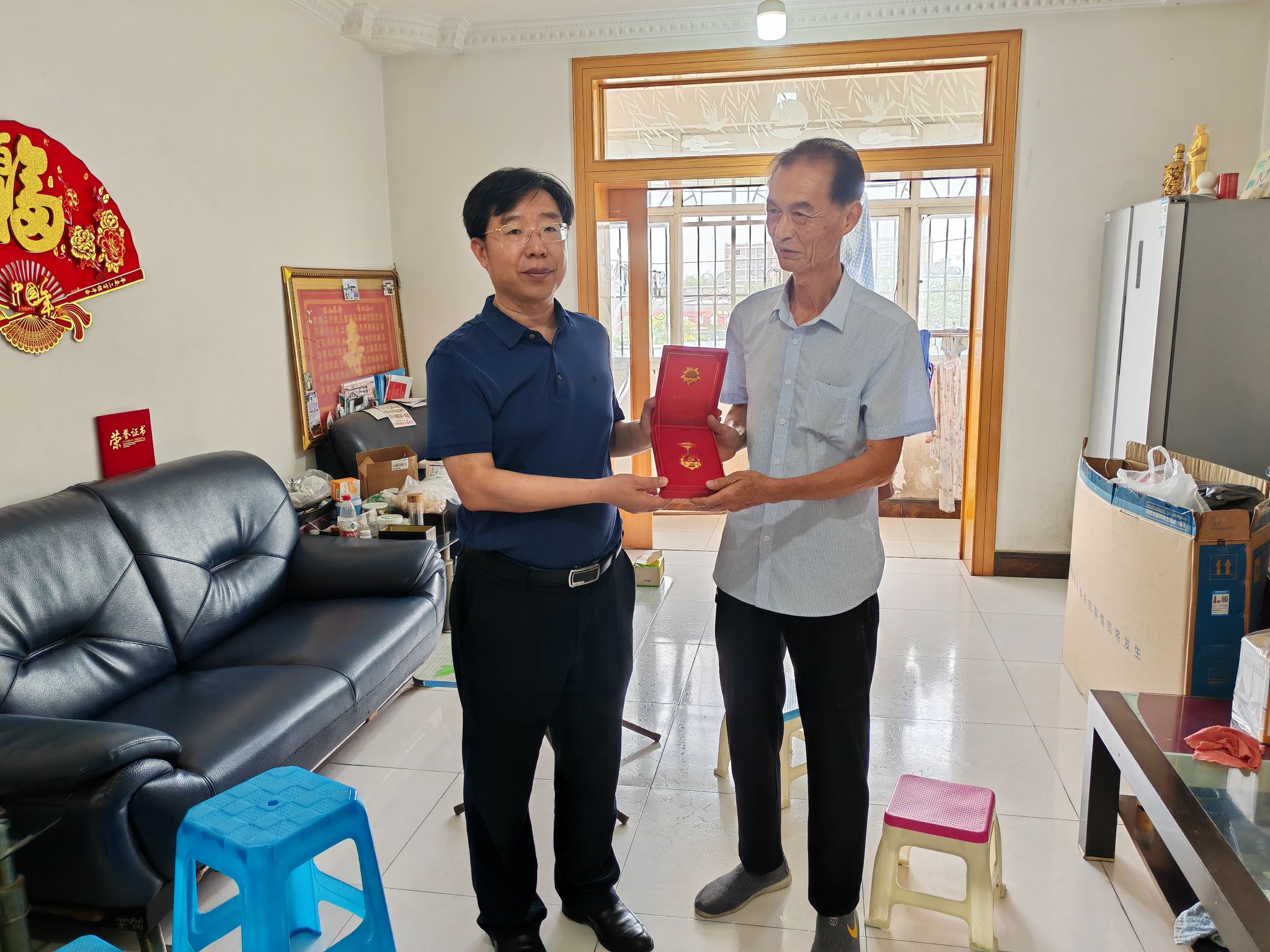 在“光荣入党50周年”老党员家中,校领导同老党员亲切地交谈,了解他和老伴的身体状况和生活状况,聆听他讲述工作往事,一起回忆往昔岁月,畅谈曾经的奋斗历程和学校的未来发展,并为其颁发“光荣入党50周年”纪念章。