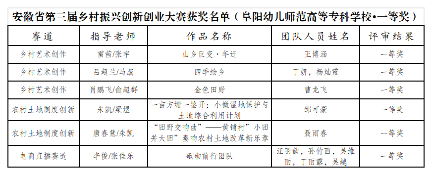 近日,由安徽省农业农村厅、安徽省乡村振兴局、安徽省教育厅、安徽省住房和城乡建设厅、安徽省人力资源和社会保障厅等单位联合主办的安徽省第三届乡村振兴创新创业大赛获奖结果出炉,我校学子凭借扎实的基础和出色的发挥,在各类赛道竞争中喜获多项荣誉,其中一等奖6项,二等奖25项,三等奖23项,优秀奖23项,刷新了我校参与该赛事新的记录。