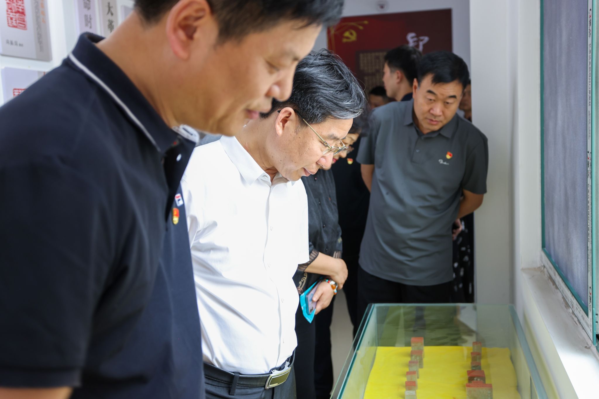 中心的“百年党史文化长廊”,创新运用丰富的图文展示打造“开天辟地”“改天换地”“翻天覆地”“惊天动地” 四大主题板块,一幕幕革命历史事件生动重现,中国共产党波澜壮阔的奋斗历程如画卷般徐徐铺陈,让在场所有人仿佛穿越时空,与革命先辈们同频共振。紧邻党史长廊的“印说党史”部分,师生篆刻展同样别具匠心,一方方篆刻作品以刀为笔,以石为纸,将中国共产党发展的不同历史时期的经典事件凝刻其中,在古朴的艺术魅力中诉说着党的峥嵘岁月的同时,也展示了我校课程思政的生动实践成果。