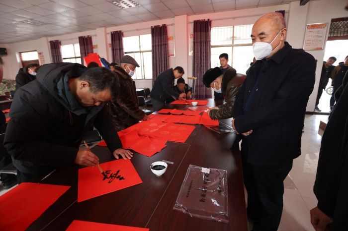 在村党群活动中心,学校书法名家们现场挥毫泼墨,一幅幅遒劲有力的春联作品跃然纸上,瞬间被早早前来等候的层层围观群众争相拿去,随着墨香的飘散,吸引了越来越多的群众前来。本次送春联活动中,共向群众送上春联300余幅,得到群众的热烈欢迎和一致好评。(图文:张向东 审核:刘志伟)