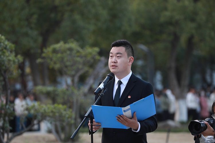 学生代表王浩同学在国旗下作《赓续奉献担当 传承雷锋精神》演讲。他表示,当代大学生要学习雷锋的“螺丝钉精神”,扎根在建设社会主义事业的一线,始终保持谦虚谨慎、不骄不躁、艰苦奋斗的作风,为社会主义现代化建设贡献新的力量。