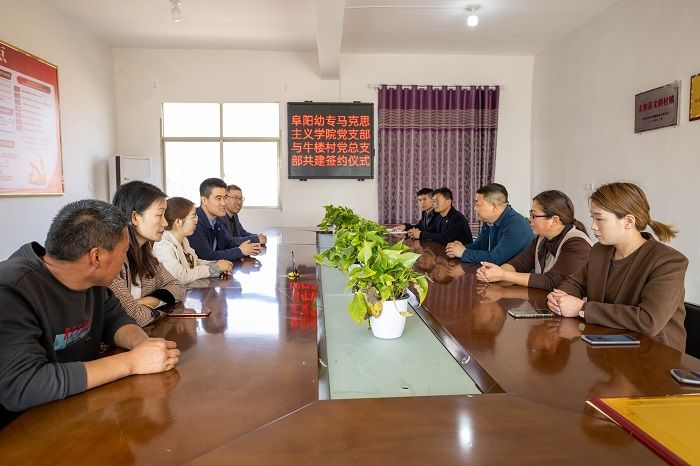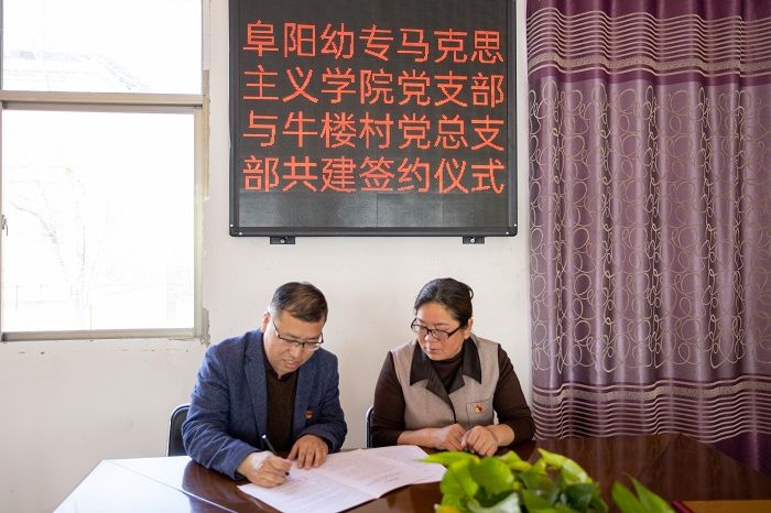 皖北三月,春和景明。在校组织人事处副处长高天睿、太和县宫集镇党委书记范兆彬见证下,牛楼村党总支书记刘若云和马克思主义学院党支部副书记李支援签署了《党建结对共建协议书》,并举行了党建共建单位授牌仪式。通过签订协议,实现双方党建理论同学、服务同行、品牌同铸、成效同享,为提高基层党组织的创造力、凝聚力和战斗力,提供了良好的平台。
