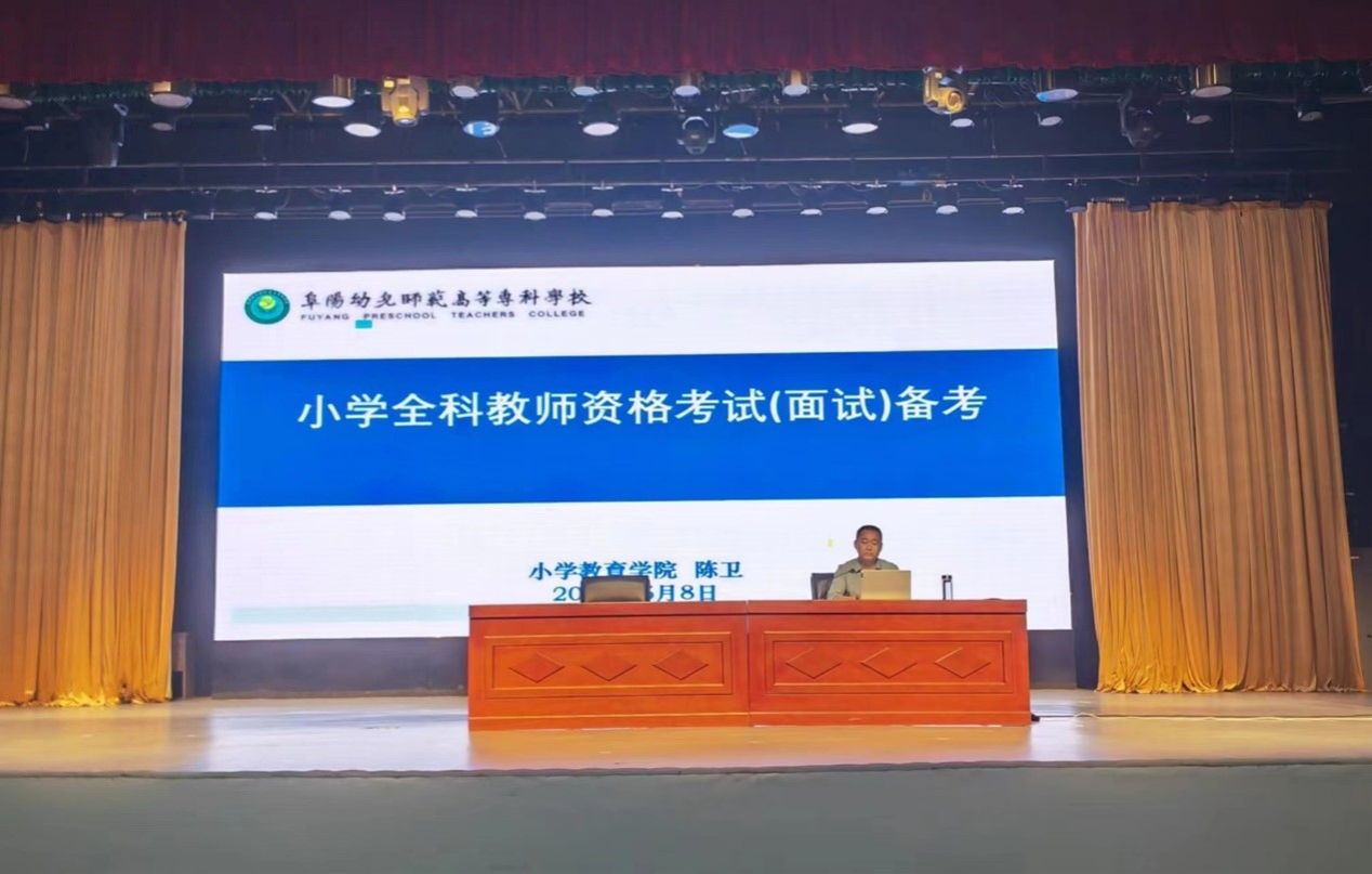 5月8日,小学教育学院名师大讲堂邀请有着丰富教资考试培训经验的优秀教师——陈卫教授向21级初专小学教育专业的同学们作《小学全科教师资格考试(面试)备考》主题讲座。