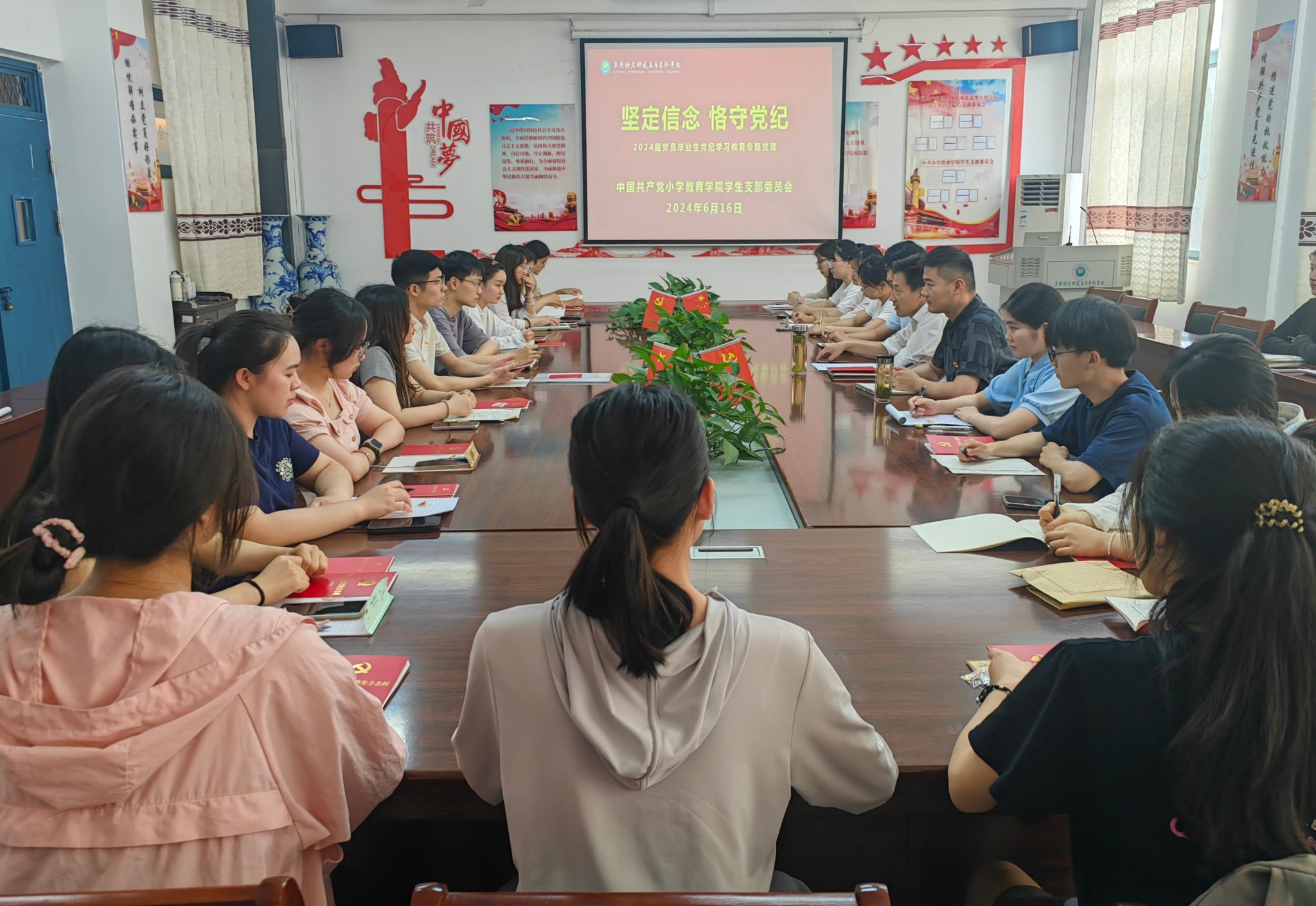 朱启俊以《条例》最新修订的背景和过程为导引,阐述了“纪严于法、纪在法前、纪法分开”的理念,向同学们传达了党纪学习教育精神。他对《条例》修订和新增部分进行了重点阐述和解析,深入浅出,通俗易懂,使全体党员受警醒、明底线、知敬畏,切实做到将增强党性、严守纪律、砥砺作风融入日常;结合身边事教育身边人,要求全体党员都要严明纪律作风,贯彻执行和维护党的纪律,自觉将纪律要求内化于心、外化于行,确保全党目标一致、团结一致、步调一致。课后,学院党政领导和学生支部党员面对党旗庄严宣誓,重温入党誓词。