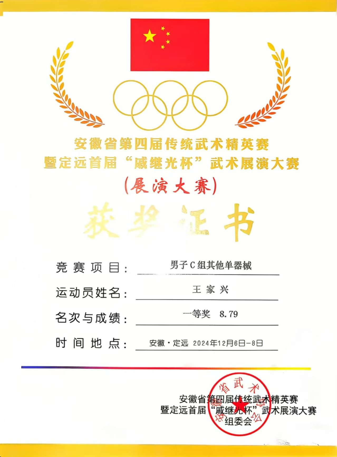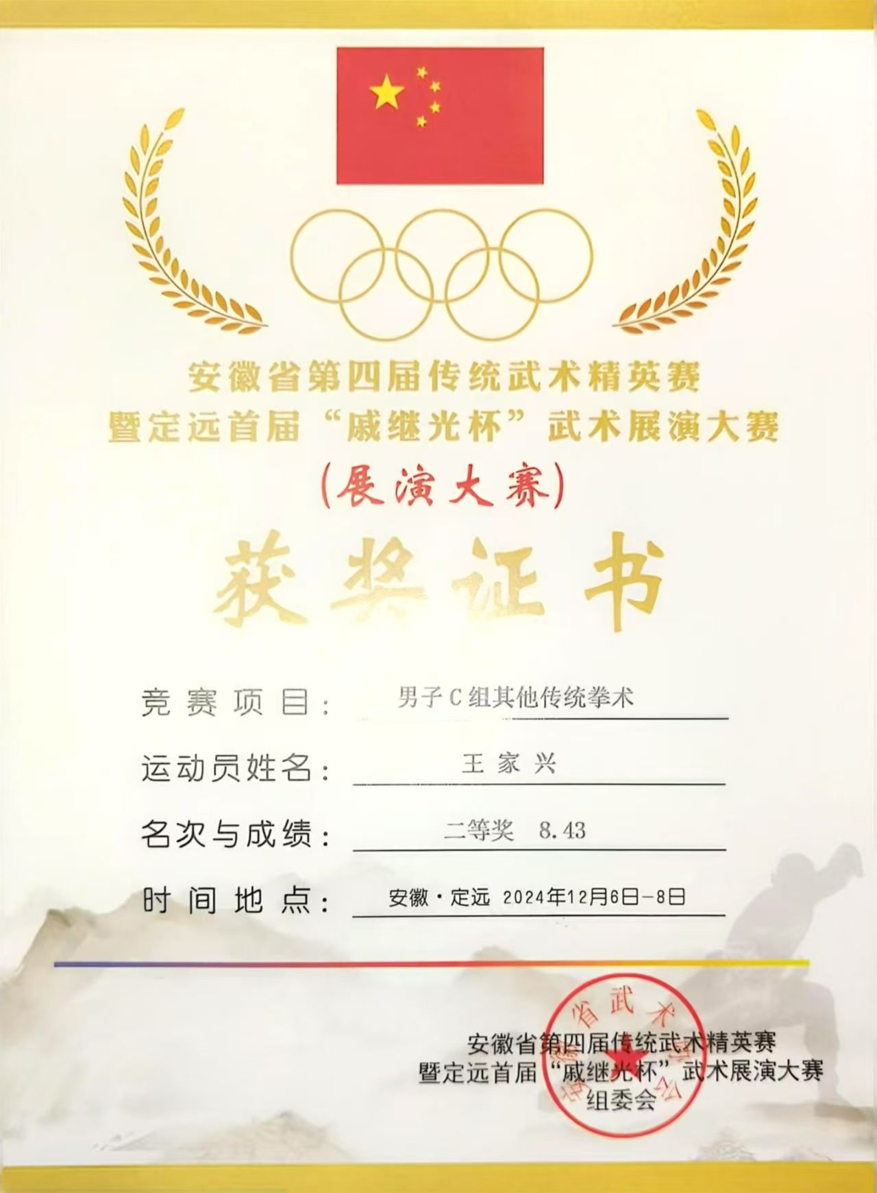 此次大赛吸引了来自全省16个地级市的1300余名运动员参与竞争。我校派出的2名优秀运动员王家兴和沈遵,在安徽省第四届传统武术精英赛暨定远首届“戚继光杯”武术展演大赛中,凭借精湛的技艺和出色的发挥,最终取得了令人瞩目的佳绩。