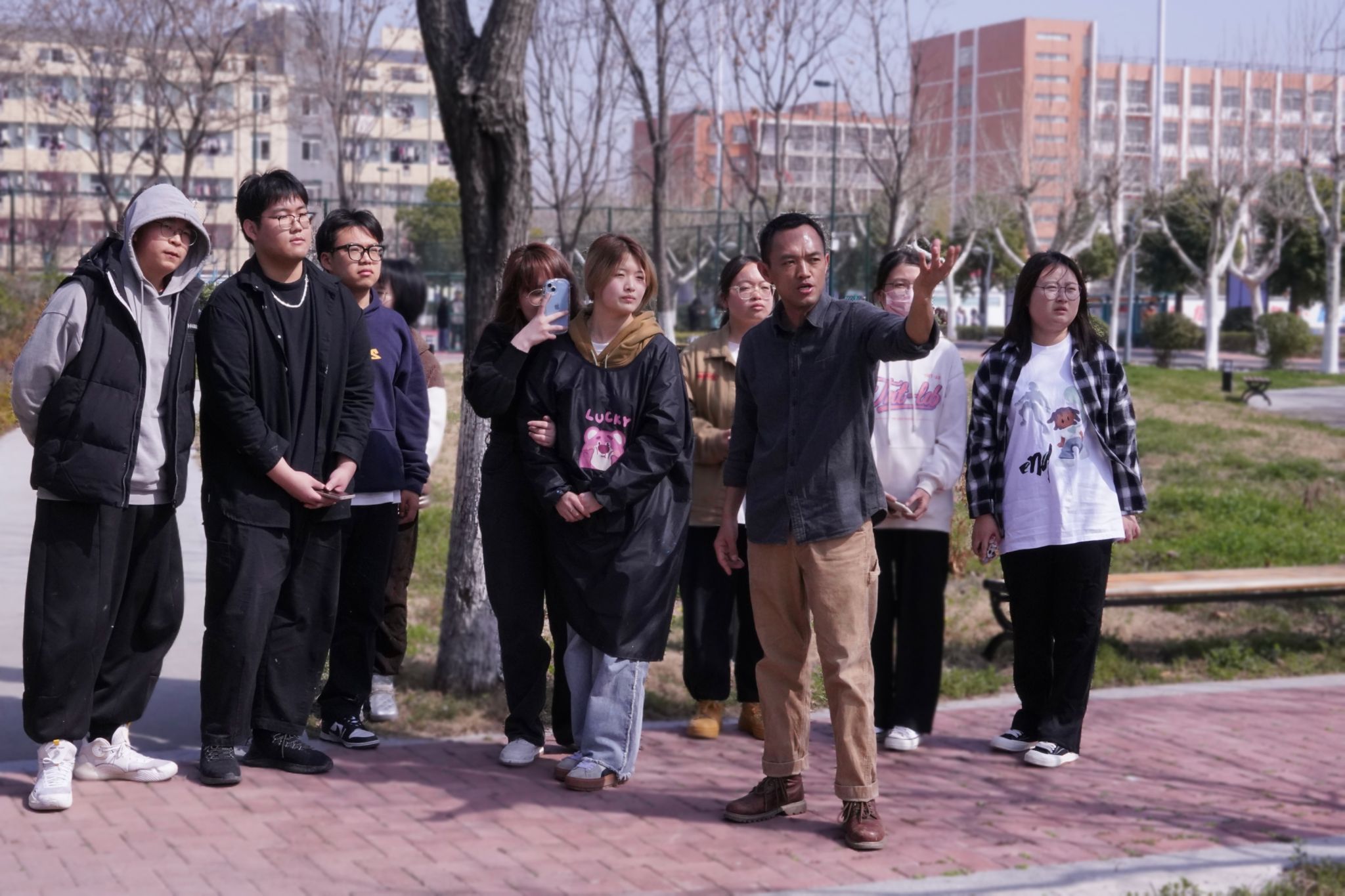 汤鹏飞老师通过对校园环境的观察、分析、概括等方法让学生们感受身边的美景,体会春天的色彩,从繁纷中用美术的眼光更加直接地感受自然、寻找色彩的秩序。引导同学们去审美去积极收集素材,三五一群,相互讨论,汇集交流。