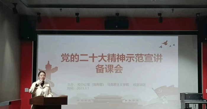 为深入学习宣传贯彻党的二十大精神,阜阳幼儿师范高等专科学校马克思主义学院于3月1日下午在红色影院开展党的二十大精神示范宣讲备课会和优秀宣讲员表彰暨宣讲员聘任仪式活动。马克思主义学院党支部书记、院长何丽娜出席。全体宣讲员和思想政治理论课教师参加活动。