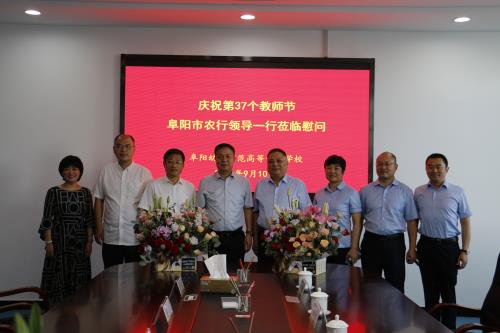 2021年9月10日上午,中国农业银行阜阳分行党委书记、行长王成平一行到我校开展教师节慰问交流活动,与我校共庆第三十七个教师节,校党委书记金杰、校长汤志与王成平一行举行座谈。
