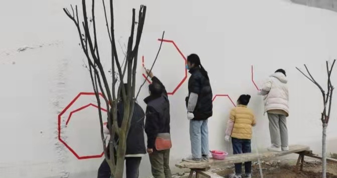时值小雪节气,天气阴沉、寒风刺骨,牛小楼村的墙绘现场却是热火朝天、如火如荼。在葛勇老师的指导下,志愿者们充分发挥艺术专业才能,默契配合,分工明确,团结协作。在志愿者们精湛娴熟的画笔下,一幅幅别具匠心、栩栩如生的墙绘逐渐印制在牛小楼村民们的房前屋后。