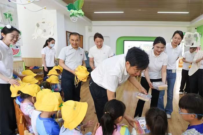 董志诚一行来到教室,与孩子们亲切交流,并为他们送上节日祝福和礼物,祝孩子们快乐生活、茁壮成长。随后,详细查看了幼儿园的基础设施、园所文化、师资配备、教学管理等情况,对幼儿园当前的工作和取得的成绩给予肯定。