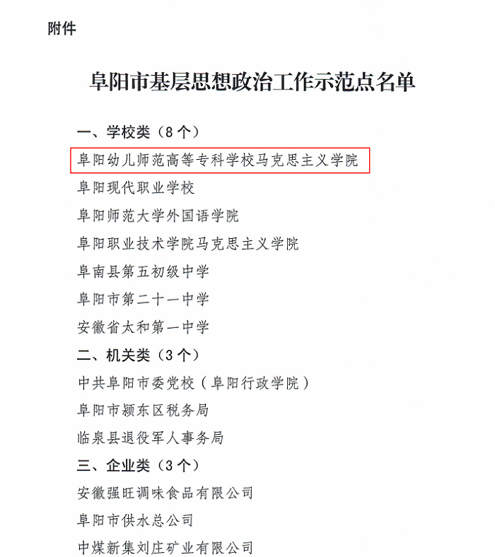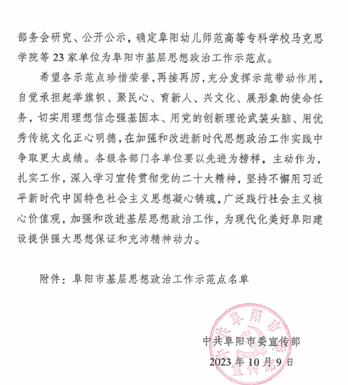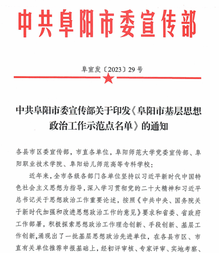 近日,阜阳市委宣传部印发《中共阜阳市委宣传部关于印发<阜阳市基层思想政治工作示范点名单>的通知》,我校马克思主义学院获评“阜阳市基层思想政治工作示范点”称号。
