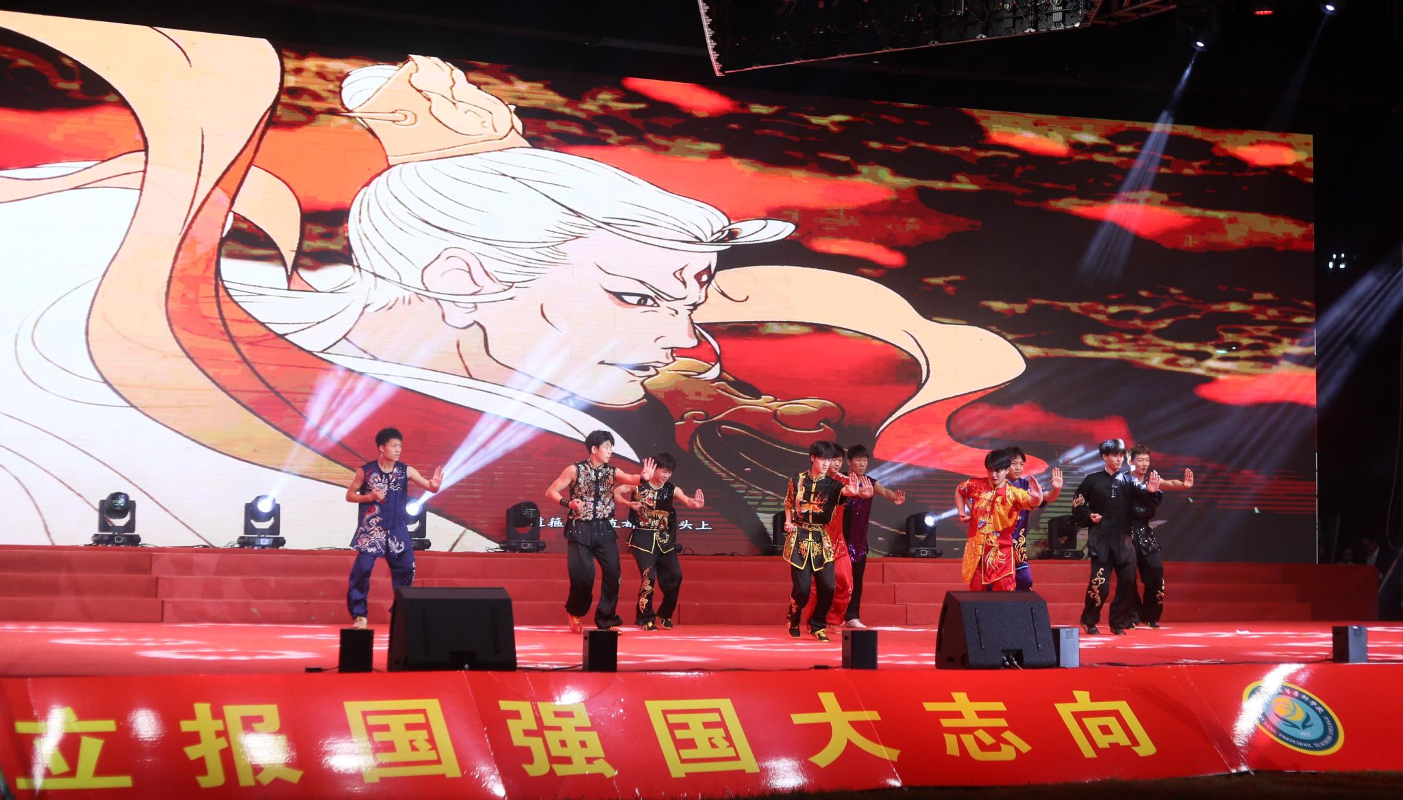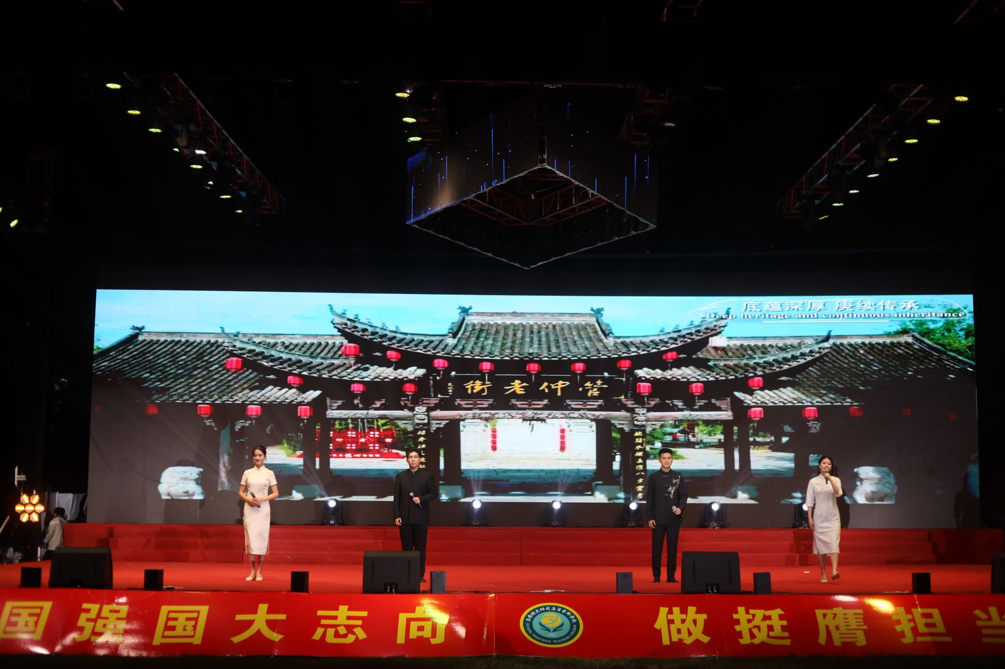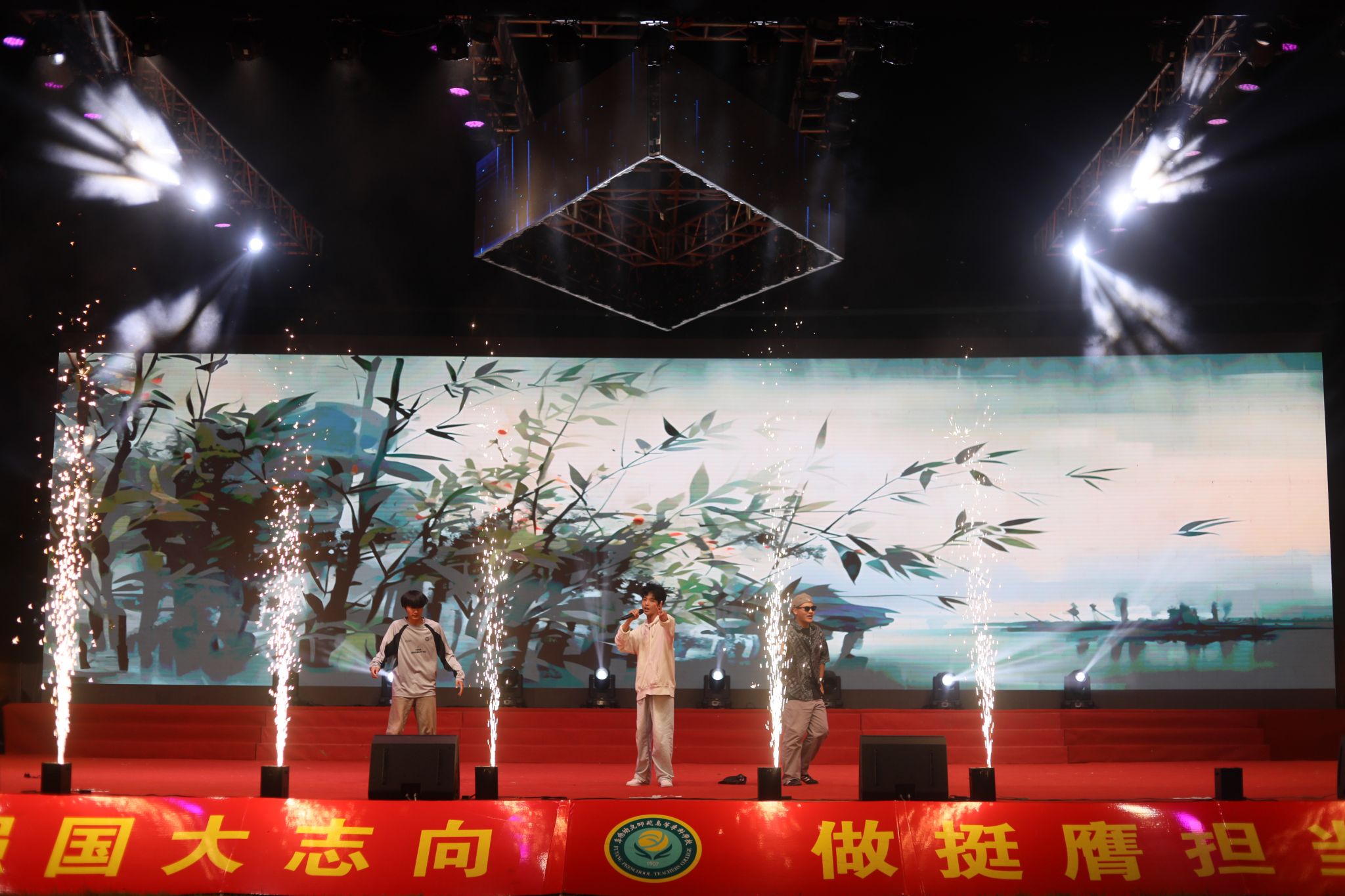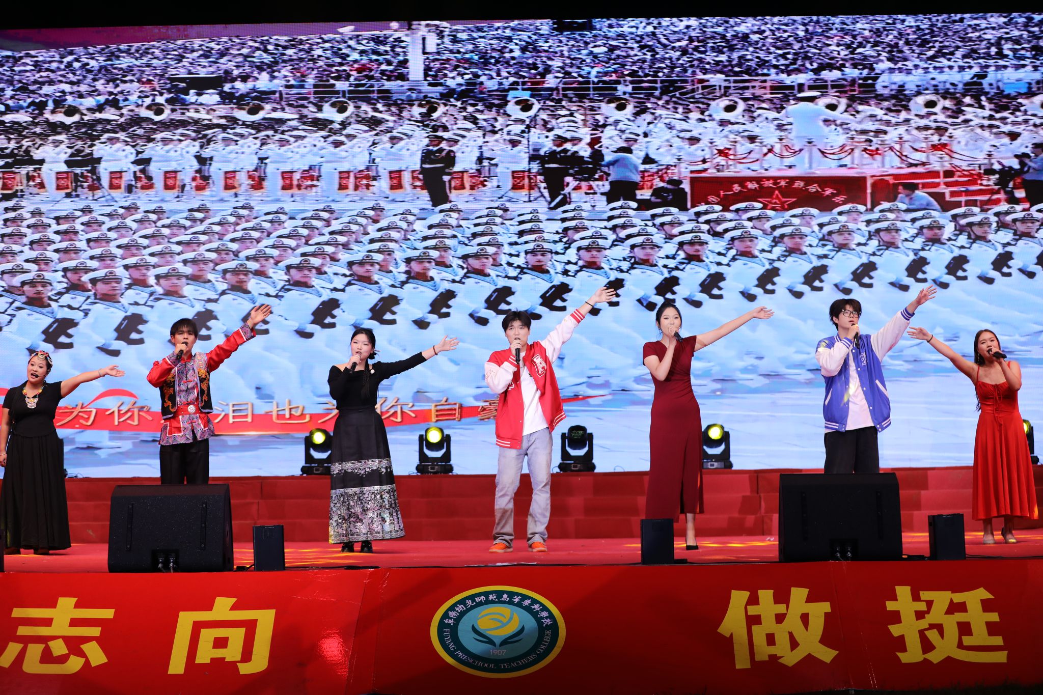 夜幕降临,华灯初上。迎新晚会在充满活力的合唱《那段时光》中拉开序幕。晚会融合歌曲、舞蹈、武术、乐器等丰富形式,将中国文化、中国精神、中国梦想、中国情怀等内涵融入诸多原创节目之中,将时代主题与阜阳市情、阜阳发展、学校内涵紧密结合,将思政教育与文体活动深度融合,在新中国成立75周年之际向祖国献礼。