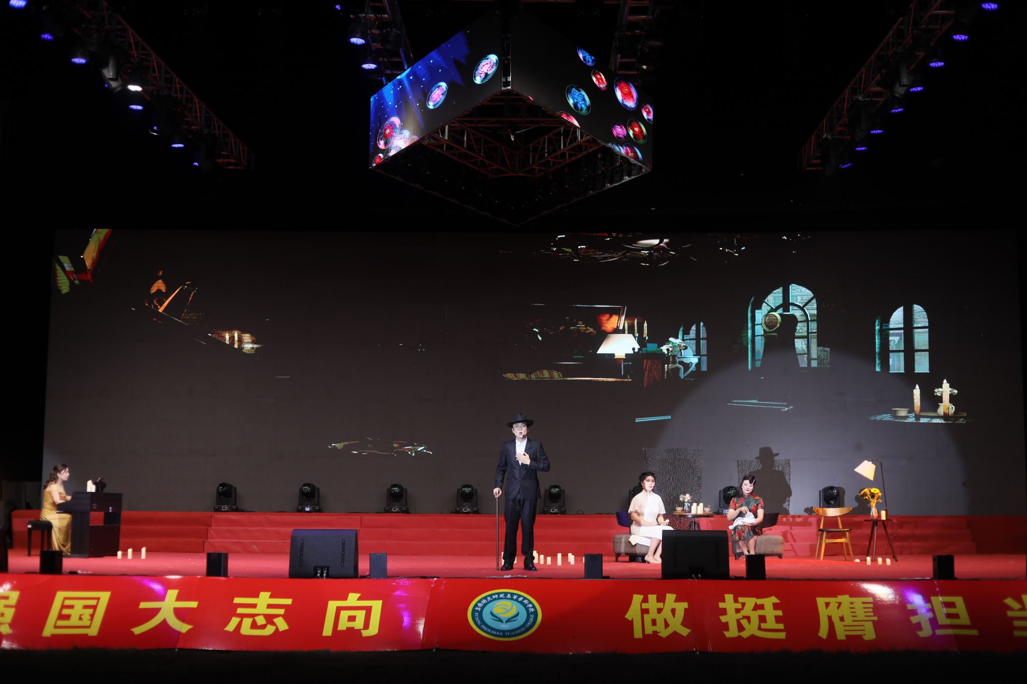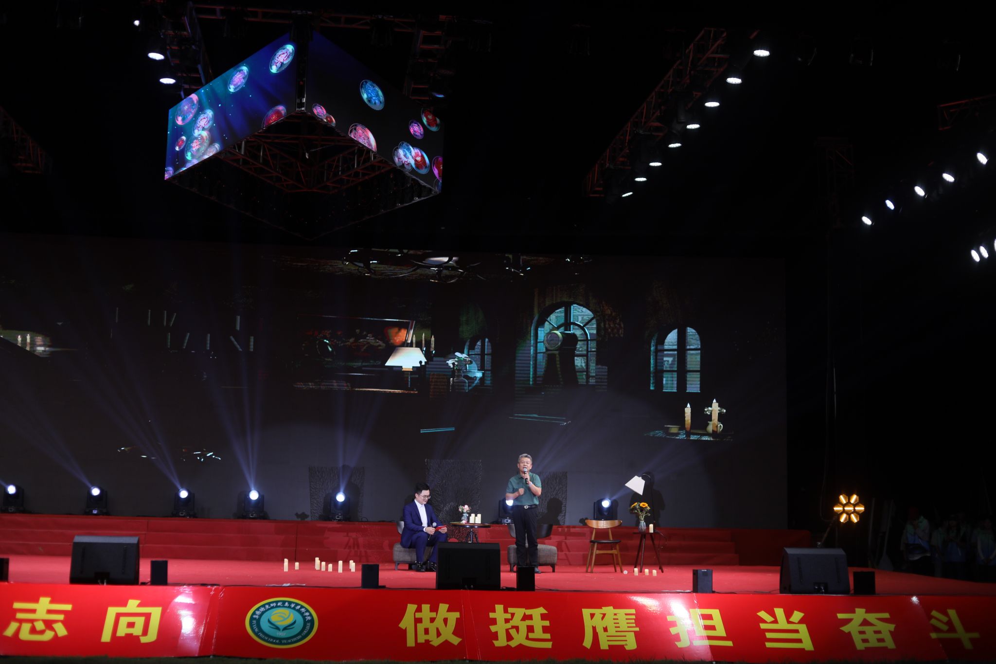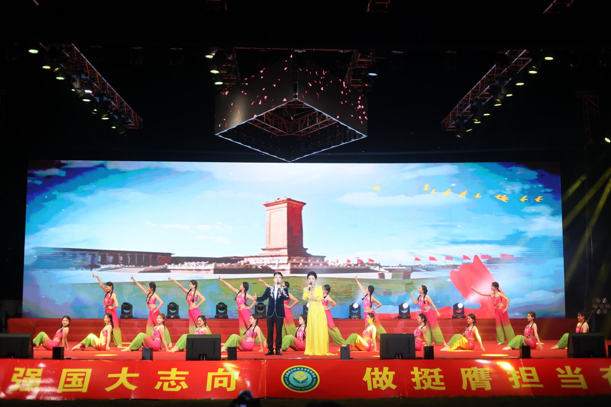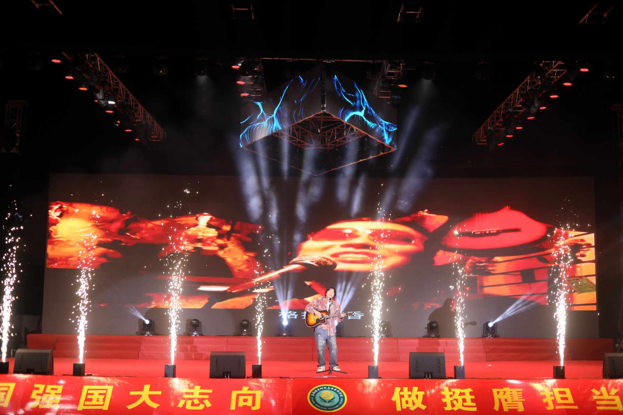 夜幕降临,华灯初上。迎新晚会在充满活力的合唱《那段时光》中拉开序幕。晚会融合歌曲、舞蹈、武术、乐器等丰富形式,将中国文化、中国精神、中国梦想、中国情怀等内涵融入诸多原创节目之中,将时代主题与阜阳市情、阜阳发展、学校内涵紧密结合,将思政教育与文体活动深度融合,在新中国成立75周年之际向祖国献礼。