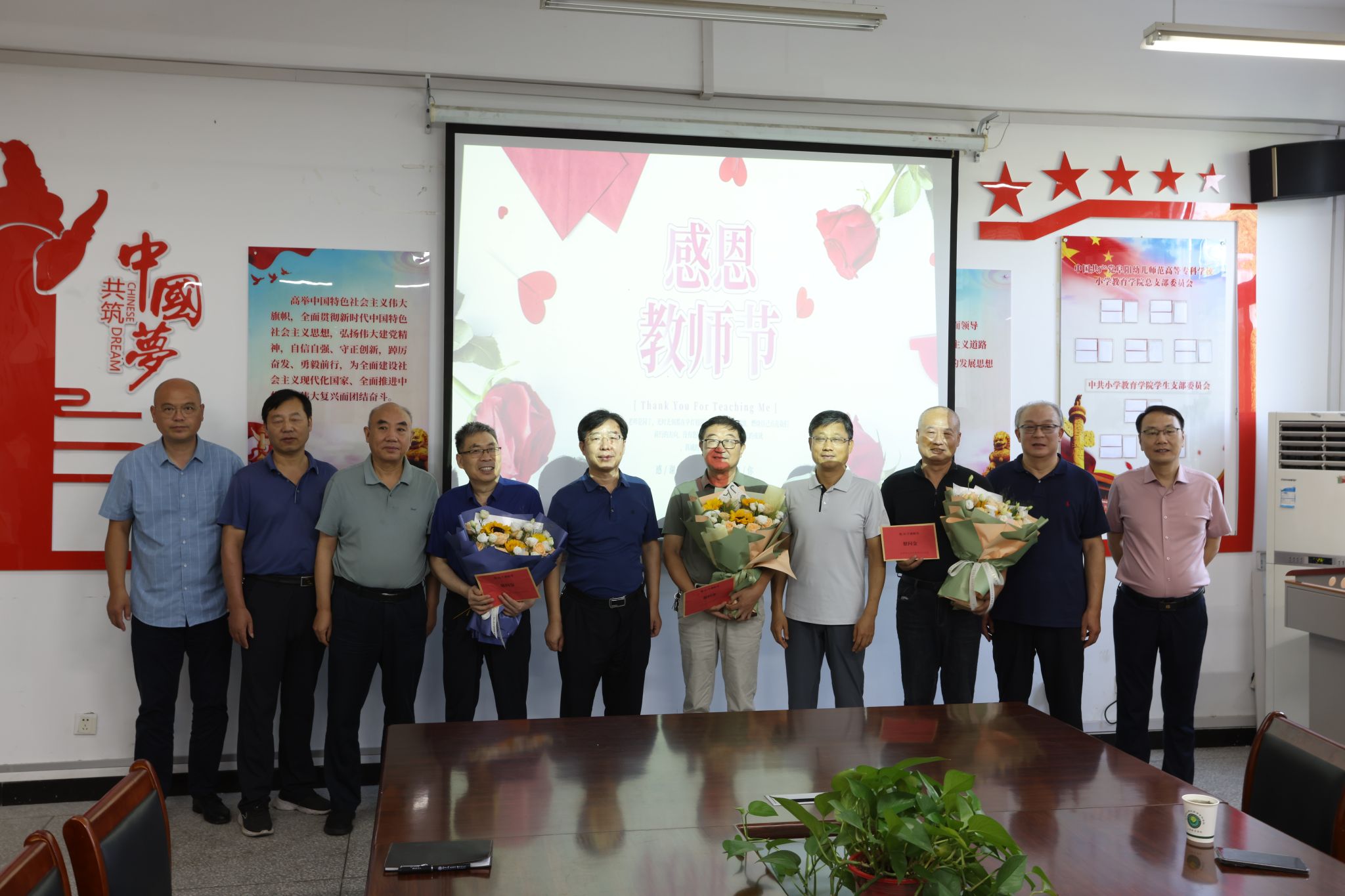 在小学教育学院,校领导向师德标兵董磊、余广清和刚做完手术的张继清老师送上鲜花和节日祝福,感谢他们为学校的建设发展作出的贡献,希望老同志保重身体,一如既往地关注支持学校发展,发挥“传帮带”作用,继续为教育事业奉献余热。