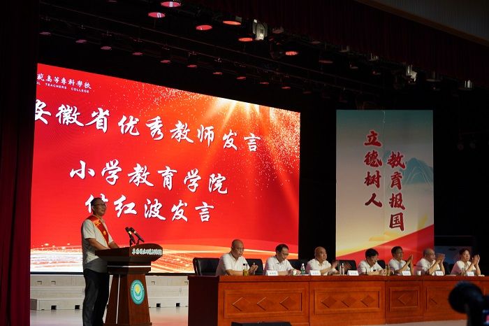 省优秀教师付红波和受表彰的师德师风标兵代表、优秀教师代表、优秀教育工作者代表、优秀辅导员代表、先进集体代表分别发言。他们分享了自己对教师的责任、使命、担当、情怀的理解和坚守,表示未来将继续怀揣对教育的热爱与执着,继续提升师德修养和业务水平,以更加饱满的热情投入到教育事业中,为阜阳幼专辉煌的明天、为国家的教育事业贡献自己更大智慧和力量。