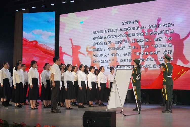 颁奖典礼中,学校新入职的教师进行了集体宣誓,并对学校评选出来的师德标兵、最美教师、最美辅导员、最美教学团队进行了表彰,获奖老师们在全场的掌声中,次第上台,捧起的荣誉证书,使晚会气氛更加隆重和庄严。