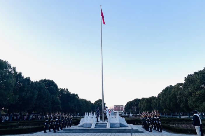 清晨,曙光初照,随着激昂的《义勇军进行曲》奏响,英姿飒爽的国旗护卫队迈着整齐有力的步伐护送国旗入场。在全体师生庄严肃穆的注目下,鲜艳的五星红旗冉冉升起,迎风飘扬。
