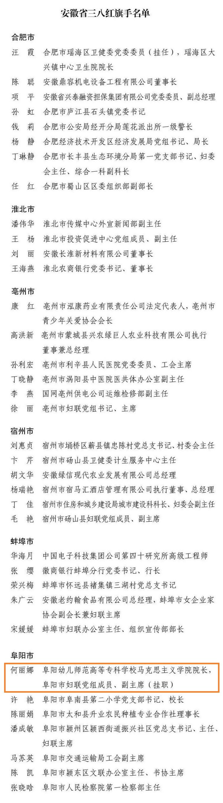 3月7日,安徽省纪念“三八”国际劳动妇女节113周年暨表彰大会召开,我校马克思主义学院院长何丽娜同志被授为安徽省三八红旗手。