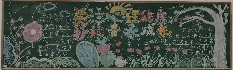 24托育2班的黑板报以“关注心理健康,护航青春成长”为主题,通过一幅幅精美的插画和温馨的话语,表达了关注心理健康、珍爱生命的美好愿望。同时,也引导同学们该如何培养自信心。22学前9班也在黑板报中为同学们分享了一首健康歌,“心平气和性开朗,严于律己贵有章;自娱自乐多保重,身心健康有延长”。这些黑板报都在通过多样化的形式,让同学们在轻松愉快的氛围中学习心理健康知识,提升自我认知与调节能力。