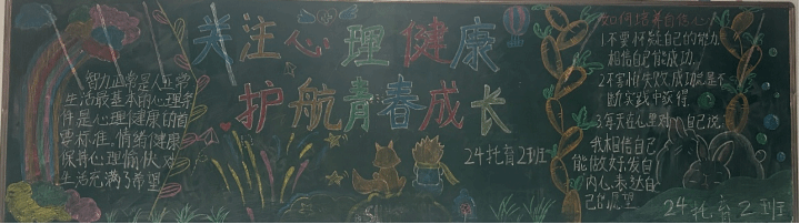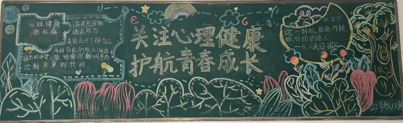 近日,为进一步普及心理健康知识,提升同学们的心理健康意识,学前教育学院举办了一场以“关注心理健康,护航青春成长”为主题的黑板报宣传活动,为同学们的青春成长之路保驾护航。