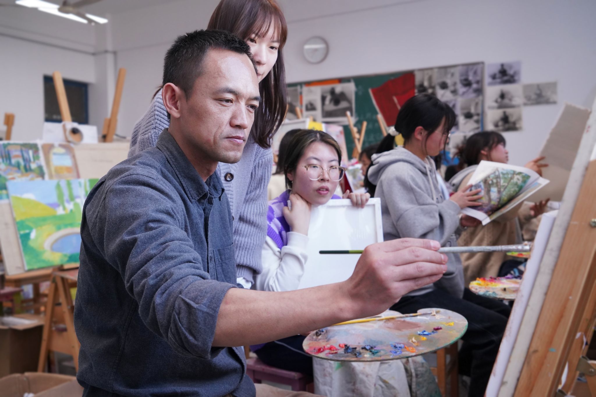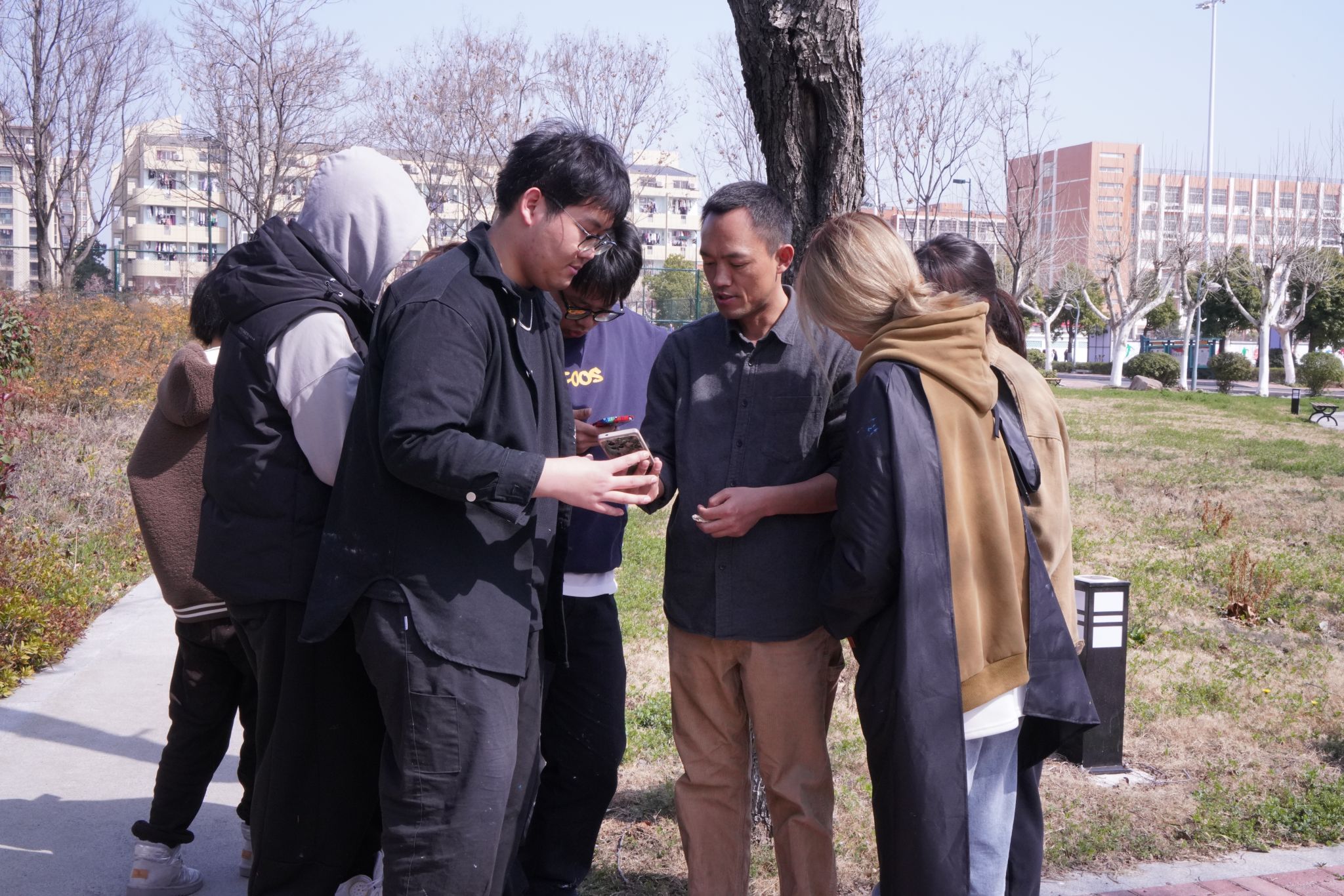 汤鹏飞老师通过对校园环境的观察、分析、概括等方法让学生们感受身边的美景,体会春天的色彩,从繁纷中用美术的眼光更加直接地感受自然、寻找色彩的秩序。引导同学们去审美去积极收集素材,三五一群,相互讨论,汇集交流。