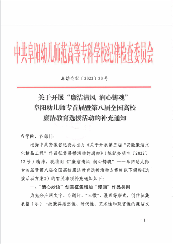 关于开展 “廉洁清风 润心铸魂” 阜阳幼儿师专首届暨第八届全国高校廉洁教育选拔活动的补充通知