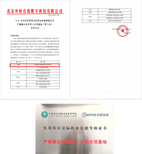 2024年9月,我校被认定为全国“1+X 证书实用英语交际职业技能等级证书产教融合协同育人示范基地(第二批)”。