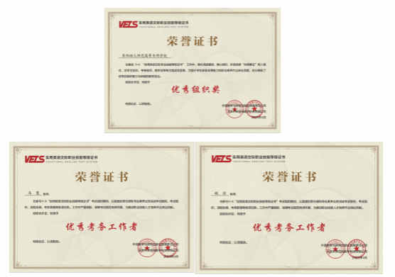 2025年4月,在2024年度“1+X 实用英语交际职业技能等级证书(VETS)”实施工作评选中,我校获“优秀组织奖”。马慧老师和姚洁老师在VETS考试组织工作中的表现优异,荣获“优秀考务工作者”称号。