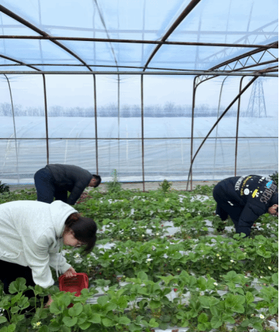 随后在工作人员的指引下,大家进入一个个结满不同品种草莓的塑料大棚内,穿梭在一道道田埂中;帮助农户进行采摘、除草、浇水、施肥等。
