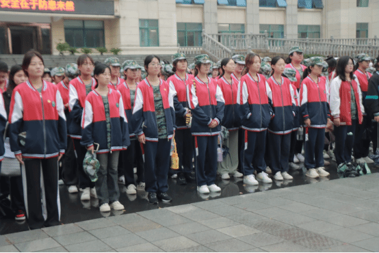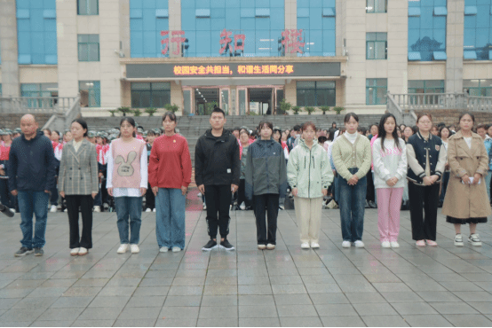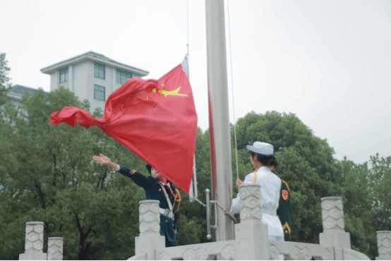 上午7时,升旗仪式正式开始,国旗护卫队护送五星红旗入场,全体师生肃立,齐唱国歌,行注目礼。