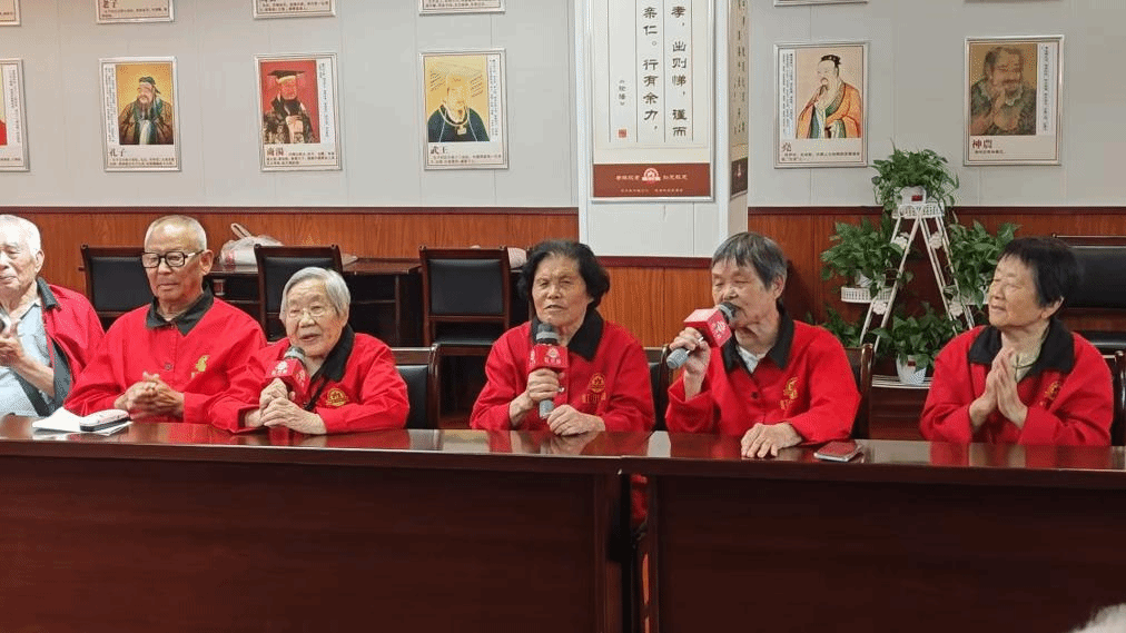 “没有共产党就没有新中国,没有共产党就没有新中国......”活动当日,“红叶林”养老院的活动室内歌声阵阵、掌声不断。在三位奶奶的领唱下,《没有共产党就没有新中国》的旋律响彻会场,老党员们身着整洁的红色统一服装,歌声充满了力量。学生们围坐四周,有的轻轻打着节拍,有的举起手机记录这感人瞬间,两代人用歌声架起了跨越时空的精神桥梁。老党员郭爷爷朗诵了自己的原创诗歌《养老院之歌》:“养老公寓是方向,老有所养人心畅。......没有共产党,就没有综合国力位列世界前茅的中国,全民安康,福寿同享。”朴实的语言饱含深情,真挚的情感打动了在场所有人。