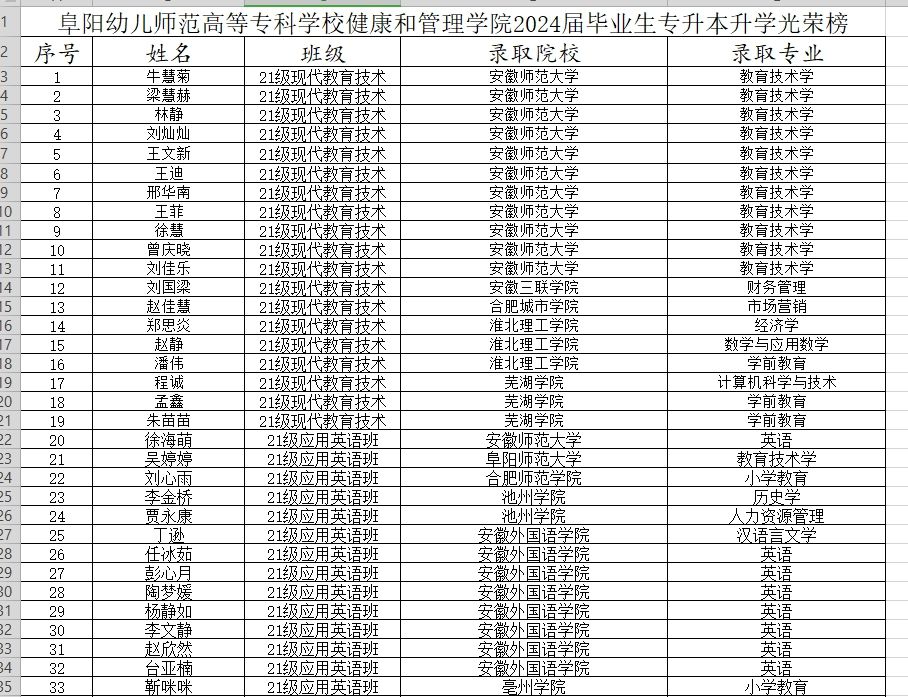 仲夏时节,桃李飘香。2024年安徽省普通高等学校专升本招生统一考试录取结果陆续发布,健康和管理学院学子捷报频传。今年学院毕业生109人,报名参加专升本考试71人,达线69人,66人被安徽师范大学、阜阳师范大学、安徽建筑大学等高校录取,报考录取比例达92.96%,其中2021级应用英语班报考录取率100%。录取人数、录取比例等各项指标均创历史新高!