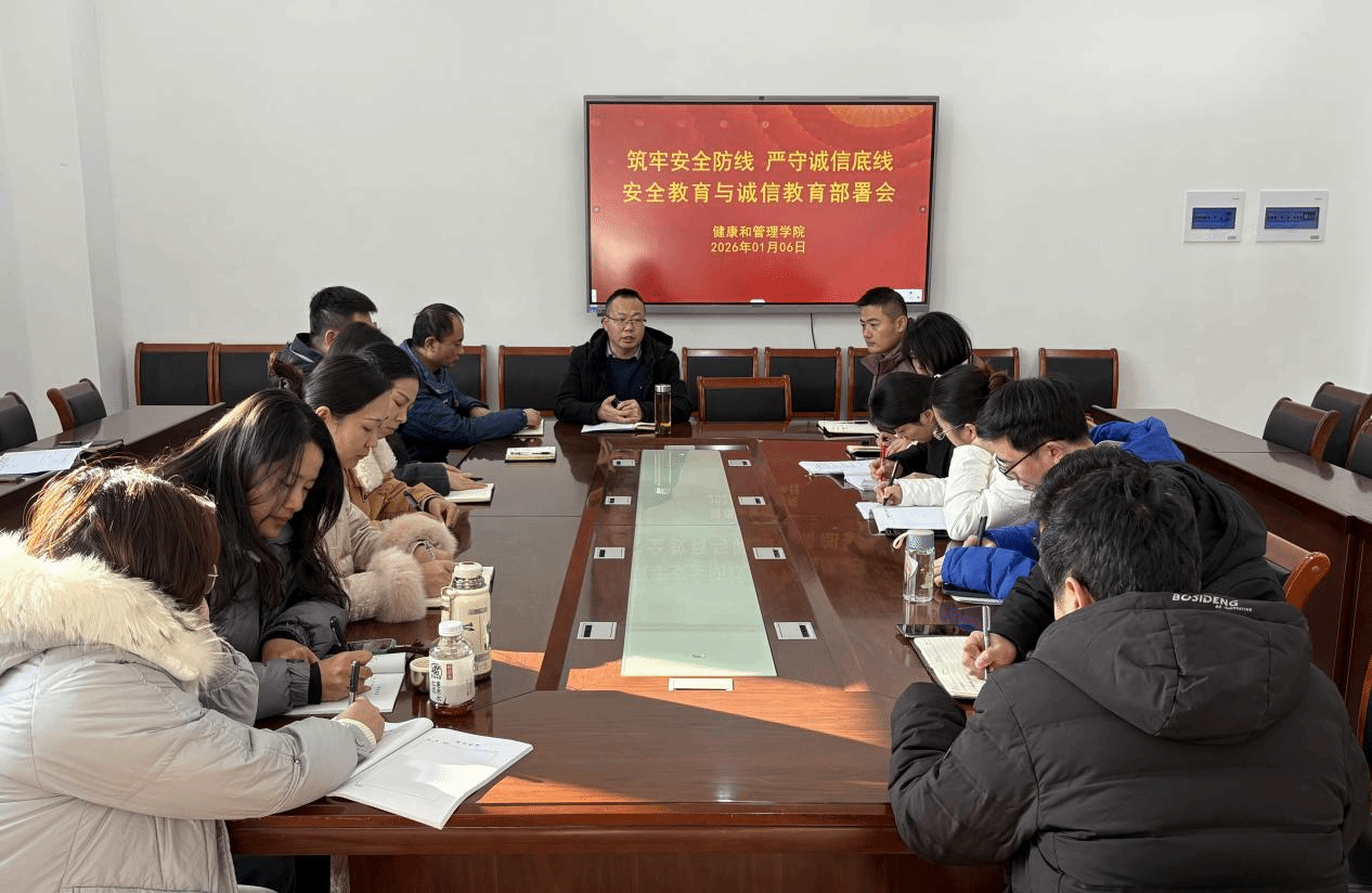 临近期末考试关键节点,叠加冬季安全事故易发时段,为切实强化学生安全防范意识与纪律观念,保障期末各项工作平稳有序开展,营造安全、诚信的校园环境,1月6日,健康和管理学院在至善楼414会议室召开安全教育与诚信教育专项部署会。学院院长严岳峰主持会议,全体行政人员、专兼职辅导员参会。