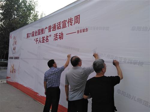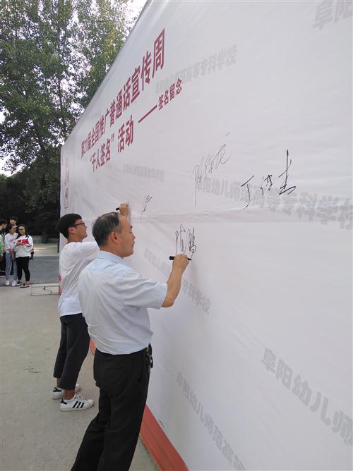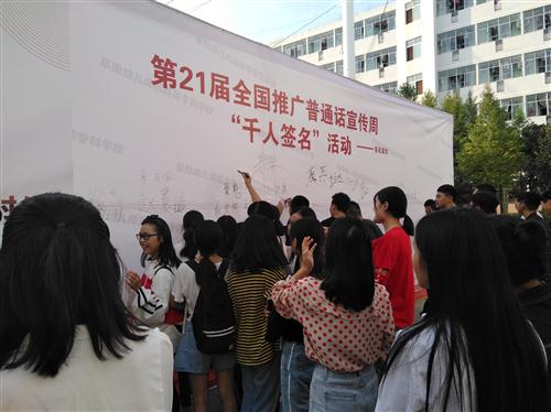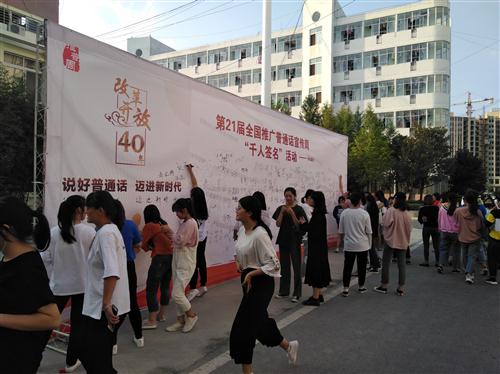 今年9月10日至16日是第21届全国推广普通话宣传周,为切实做好本届推普周宣传活动,进一步推进语言文字规范化工作,9月11日,校语委办、校团委举行了以“说好普通话,迈进新时代”为主题的“千人签名”活动。
