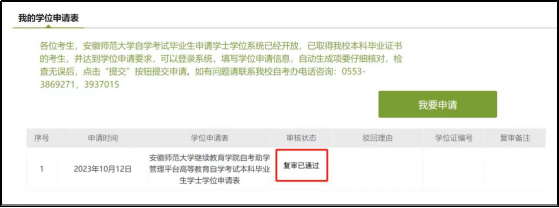 (3)若【申请状态】显示“复审已通过”,表示你已经通过校方线上学位申请资格审核,后续等待校学位委员会审议通过、公示和邮寄学位证书。