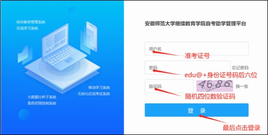 (2)依次输入用户名为准考证号码、密码(edu@ +身份证号
