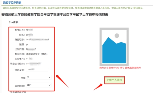 (2)进入申报信息填写界面 ,首先确认个人准考证号、姓名、 身份证号码、性别等个人基本信息是否正确,注意确定民族/政治面貌是否为准确信息!右侧点击【上传个人照片】选择本地照片文件上传(注意照片清晰度、尺寸)。