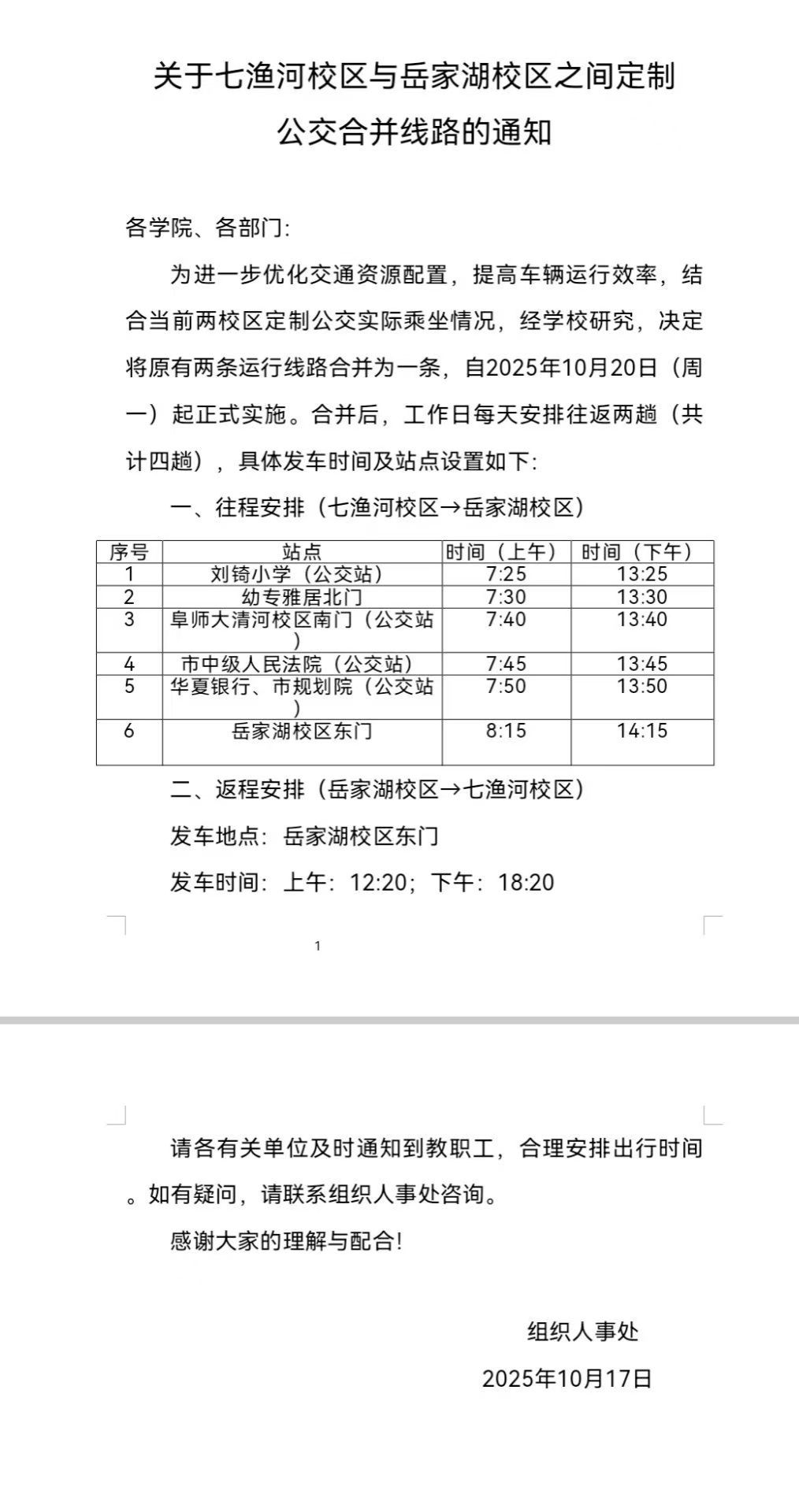 关于七渔河校区与岳家湖校区之间定制公交合并线路的通知